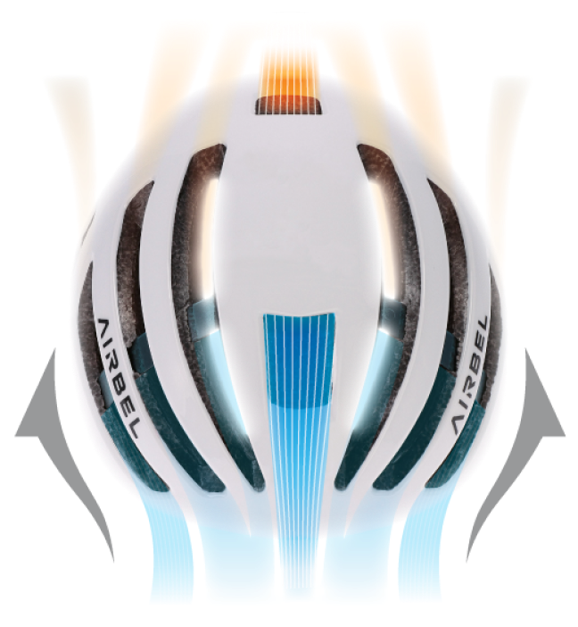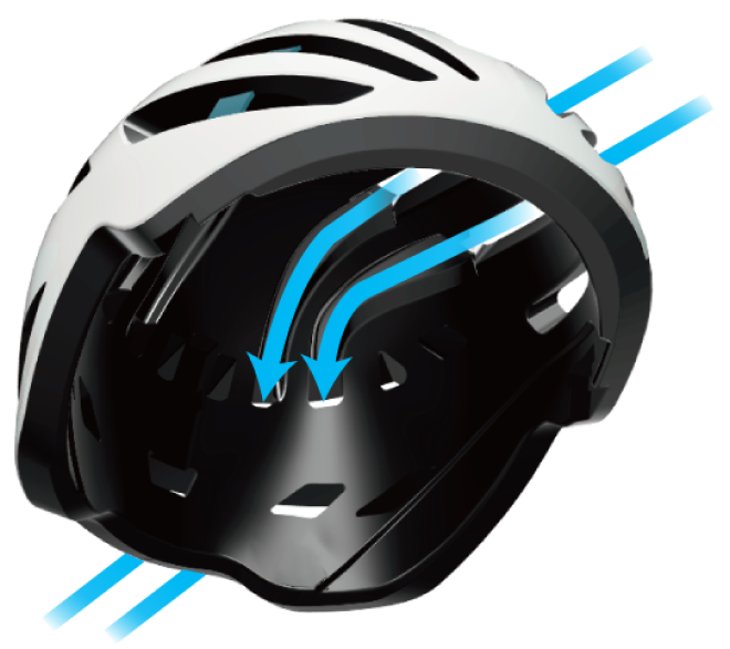 ヘルメット内の熱を自然と後方へ排出する設計で、快適なかぶり心地を実現。前面に6箇所配置した通気孔と、ヘルメット内部につがった溝が、こもりがちな頭部の熱を速やかに排出します。