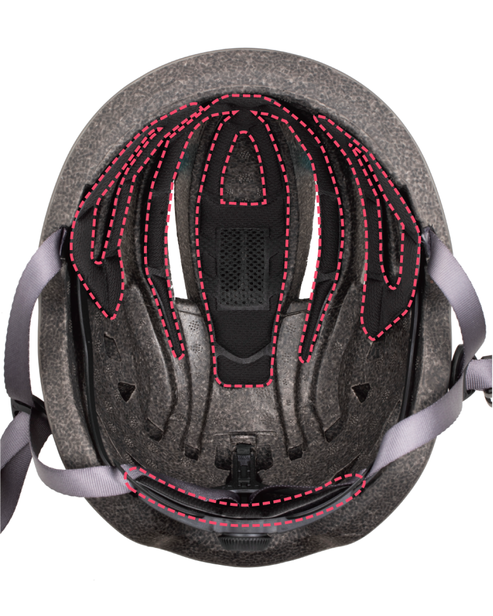前面に6箇所大きく空いた孔は、進行方向から大量の風を取り込みます。また、取り込んだ空気を後方に効率よく流すため、内部に溝を配置。ヘルメットと頭部の間にも効率的に風を通し、熱がこもりにくい設計です。